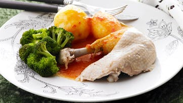 Skyl kyllingen godt, læg den i en gryde og hæld vandet på. Skræl gulerødderne, rens porre og peberfrugt og skær dem i mindre stykker. Kom grønsager, salt, peberkorn og persille ned til kyllingen og bring vandet i kog. Lad kyllingen koge under låg i 1 time, til den er mør. Tag kyllingen op og sigt kogevandet. Blend 3 dl kogevand med gulerødder og peberfrugt og giv det et opkog. Smag sovsen til med peberrod, salt og peber og server med kogte kartofler og dampet broccoli.