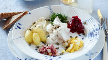Drys torskefileterne med lidt salt. Bring vand i kog, tilsæt 1 tsk. salt pr. l. Læg torsken i og sluk. Lad torsken trække i kogevandet i 8-12 min. afhængigt af størrelsen. Si lagen. Afbag smør med mel og spæd med kogevand. Smages til med sennep og rundes med fløde, salt og peber. Server torsken med diverse tilbehør.