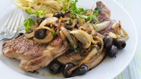 Krydr kødet på begge sider med salt og peber. Opvarm halvdelen af olien i en stor sautérpande, til den er gloende varm. Brun lammekoteletterne hurtigt på begge sider. Læg dem på en tallerken og afkøl dem. Opvarm resten af olien i samme pande og hæld tyndt skivede løg i. Lad dem stege i 15 min. ved svag varme, til de er bløde, ikke brune. Rør rundt undervejs. Skyl og hak ansjoserne. Tilsæt urter, ansjos, oliven, salt og peber.