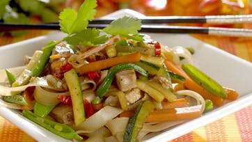 Skær kødet i lillefingertykke stykker. Skræl ingefær, udkern chili og pil løg og hvidløg. Hak det hele fint. Skær skrællet gulerod, skyllet courgette og sukkersnaps i tændstikker eller stave. Hæld olien i en wok og steg krydderblandingen i 1 min. ved høj varme. Kom gulerod, courgette og sukkersnaps ved, så kødet og til sidst sojaen. Alt i alt tager dette ikke meget mere end 7 min. Kog af med soja og server med pynt og tilbehør.