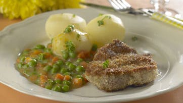 Vend nakkekoteletterne i sammenpisket æg og derefter i rasp blandet med salt og peber. Brun dem ca. 1 min. på hver side ved middelhøj varme. Steg koteletterne ved svag varme, 6-7 min. på hver side, til de er gennemstegte. Kog bouillonen op med ærter og gulerødder. Rør smør og mel til en smørbolle og rør den i grønsagerne, så den jævner vandet. Lad stuvningen koge i 5 min. under omrøring, og tilsæt persillen. Smag til med salt og peber og server med kogte kartofler.
