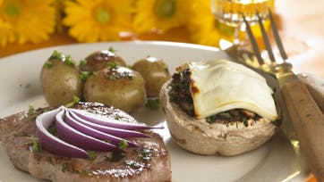 Børst svampene og bræk stokken af. Vælg 6 hatte ud og læg dem med lamellerne opad i et ovnfast fad. Skær resten af svampene og stokken i små tern og rist dem i smørret sammen med løget i 5 min. Tilsæt persillen og smag til med salt og peber. Fordel svampeblandingen i de 6 hatte og læg en tynd skive feta over hver. Gratiner svampene i ovnen ved 225° i 10 min. Bland persillen med salt og peber og vend koteletterne heri, så persillen hænger ved. Steg koteletterne ved middelhøj varme i 5 min. på hver side. Server med persilleristede kartofler.