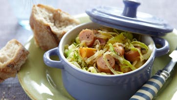 Svits baconen i olien i en tykbundet gryde, tilsæt paprika og løg og lad det svitse med i 1 min. Tilsæt halvdelen af kålen sammen med kartoflerne. Hæld bouillonen ved og lad det småkoge under låg i 10 min. Tilsæt pølserne og resten af kålen og lad det simre i yderligere 5 min. Smag til med salt og peber og server med et stykke groft brød til.