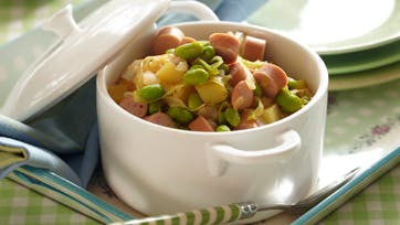 Svits baconen i olien i en tykbundet gryde, tilsæt paprika og hakket løg og lad det svitse med i 1 min. Snit kålen i strimler og skær kartoflerne i tern. Kom kartofler og kål i gryden sammen med bouillon og lad det småkoge under låg i 10 min. Tilsæt bønner og pølser i skiver og lad det simre i yderligere 5 min. Smag retten til med salt og peber og servér med et stykke groft brød.