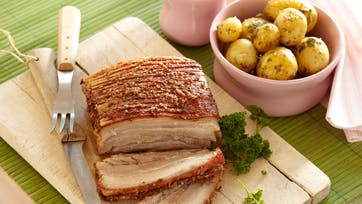 Rids sværen på stegen, knus salt, koriander og fennikel i en morter og gnid stegen med blandingen. Kom stegen i et ovnfast fad, sæt den i ovnen ved 250° i 30 min., dæmp temperaturen til 160° og lad den stege i yderigere 90 min. Kog kartoflerne i letsaltet vand i ca. 15 min., hæld vandet fra og damp dem tørre. Bland kartoflerne med salsaen, kom dem i et ovnfast fad og sæt dem ind til stegen i de sidste 30 min. Servér med thai agurkesalat.