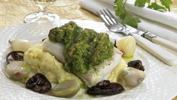 Kog kartoflerne uden salt i mindst 20 min. Mos med lidt smør og hold varmt. Blend pinjekerner, smør og purløg og drys salt og peber på fisken. Steg den i lidt mere smør på skindsiden i 3 min. Tag den op, læg i ildfast fad og smør nøddesmørret på kødsiden. Stil i ovnen ved 220° i 6 min., til det er sprødt. Kog 6 af de pillede skalotteløg i 5 min., til de er møre. Skær de sidste i tynde skiver og sauter i vin med lidt sukker. Server med bund af mos, så lidt salat og på toppen fisken. Sovsen rundt om.