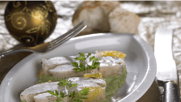 Hold formen nogle sek. i varmt vand, og vend den ud på et bræt. Skær kyllingegeleen i skiver med en god, skarp kniv og server skiverne med sauce og brød.