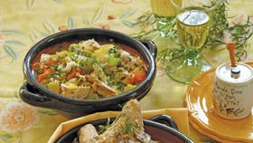 Grønsager: Pil løgene, skræl gulerødder og kartofler og skær dem i tern. Rens porrerne og skær dem i skiver. Pil og hak hvidløgene. Læg grønsagerne i gryden sammen med ½ l suppe og salt. Kog dem ca. 15 min., til de er næsten møre. Læg kyllingekødet ned til grønsagerne og varm igennem 5-10 min. Smag retten til med salt, peber og revet peberrod. Riv citronskallen. Spis kyllingen med hakket persille og citronskal.
