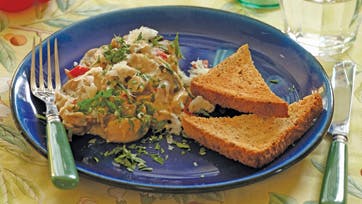 Skær kyllingekødet i små tern. Rens svampene og skær dem i skiver. Skær peberfrugten i små tern. Svits grønsagerne i smørret. Drys melet i og spæd med suppe og fløde under omrøring. Kog stuvningen igennem, rør æggeblommen i og smag retten til med salt og peber. Drys parmesan og hakket persille over. Rist brødet og servér det til kyllingen.