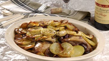 Drys kyllingen med salt og peber og brun i olie. Steg så svampene i samme olie. Skræl kartofler og skær i tynde skiver. Smør et ildfast fad og læg en bund af kartofler, så kylling, så svampe, oliven, løg i skiver, oliven og rosmarin, et lag kartofler og resten af kød, svampe, løg og rosmarin og endelig et låg af kartoflerne. Kom kogende suppe over, stil i ovnen ved 180° med alufolie over i 1 time, og så fortsættes uden alufolie i 30-45 min. Server med salat og evt. dampet kål.
