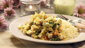 Kog kartoflerne og den ene gulerod møre i letsaltet vand. Skær den anden gulerod i tern. Svits kødet let i olien sammen med løgene. Tilsæt gulerodstern, fennikel og bouillon og lad det småkoge under låg i 10 min. Blend den kogte gulerod med lidt af bouillonen og jævn kyllingegryden med det. Tilsæt ærter, cremefraiche og dild og lad det varme igennem. Hæld vandet fra kartoflerne og lad dem dampe tørre. Smag kyllingegryden til med salt og peber og pres kartoflerne ned i en varm skål gennem en kartoffelpresser eller et dørslag.