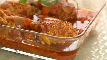 Snør kyllingelårene og gnid dem med hvidløg, olie, salt, peber og grillkrydderi. Udblød svampene i kogende vand. Brun kyllingestykkerne i olie i en kasserolle (2-3 stykker ad gangen) og kom så både af løg og stykker af gulerødder ved. Når det har stegt i 5 min., tilsættes eddike, tomater og udblødte svampe. Læg låg på og lad det småsimre i 1-1½ time, til kødet er helt mørt. Smag til, drys med persille og server med brød og bønnesalat