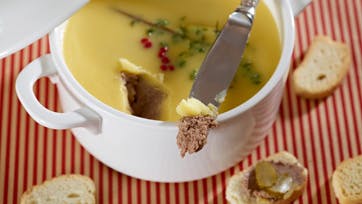 Blend leveren med løgblandingen og resten af smørret til en fin, ensartet creme og smag til med salt og peber. Kom levercremen i en lille terrin eller skål og stil den på køl i et par timer, til den har sat sig. Smelt det gemte, klarede smør, hæld det over patéen og pynt med timian. Stil patéen tilbage på køl i mindst 2 timer og server med ristet brød.