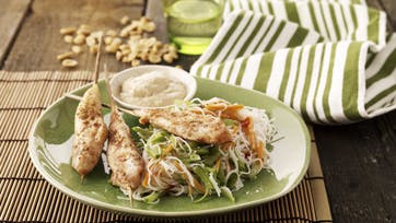 Krydr kyllingefileterne med salt og garam masala. Træk hver filet på et bambusspid og læg dem på et stykke bagepapir. Steg spiddene i ovnen ved 225° i 15 min. Kog nudlerne i letsaltet vand i 4 min. og lad dem dryppe godt af. Skær forårsløg, gulerod og sukkerærter i tynde stave og bland dem med nudler og chilisauce. Blend peanuts med hvidløg, olie, sukker, vand, saft og skal fra limefrugten og server.