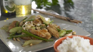 Gør alle ingredienserne klar. Steg kyllingen i strimler i olien. Tilsæt balsamico, soja, krydderier og sukker og tag det hele op. Lynsteg så løg, bønner og selleri alt i mundrette bidder. Vend kødet i og tilsæt nødder. Server med ris.