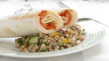 Kog perlebyggen i letsaltet vand i 10 min. og lad den dryppe godt af. Halver agurken på langs og fjern kernerne med en teske. Skær agurk, løg og peberfrugter i små tern og bland dem i perlebyggen sammen med olie, balsamico og persille. Smør tortillaerne med sennep og læg kyllingekødet og osten på. Skær peberfrugten i tynde strimler og tomaterne i skiver. Fordel tomat og peberfrugt over tortillaerne og rul dem stramt sammen. Server rullerne kolde eller lun dem let på en tør pande ved jævn varme i 5 min.