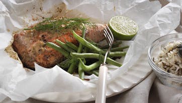 Lav to pakker med for af bagepapir og frakke af alufolie. Læg et stykke laks i hver pakke. Kom soja, fintrevet ingefær og honning ved hver og drys med peber. Luk med lidt luft til hver. Stil i ovnen ved 225° i 12 min. Tjek om fisken er klar, ellers giv den lidt mere. Kog imens risen i dobbelt så meget vand med 1/2 spsk. salt og vend de drænede ris med meget finthakket skalotteløg og purløg og drys med græskarkerner. Giv kogte grønne bønner vendt i olie og citron til.