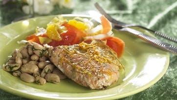 Riv skallen af lime og appelsin og pres saften af limefrugten. Bland halvdelen af den revne skal med limesaften og lidt salt og peber, hæld det over lakseportionerne og lad dem trække i 5-10 min. Skær appelsin og grapefrugter i fileter og snit julesalaten i strimler. Skær tynde bånd af guleroden og bland citrusfileter, julesalat og gulerod med resten af den revne skal. Dræn bønnerne og sauter dem i olien med hvidløg og dild og smag ti. Steg lakseportionerne på en varm pande i 3-4 min. på hver side og server.