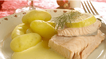 Laksen lægges i kogende vand og salt i 8 min. Er der ikke ben ved, slukkes straks. Er der ben ved koges ved 90° i 2 min., før der slukkes. Æggeblommerne piskes seje med salt og citron, sættes over vandbad og piskes luftigere med vand. Smørret, der skal have temperatur som ægget, tilsættes dråbevis, til det begynder at blive tykt, og så i en tynd stråle. Skulle det skille, kan det skilte bruges til en ny portion æggeblommer på lige fod med det smeltede smør. Lunes til højst 70° og serveres til laksen med pillekartofler og pynt af dild.