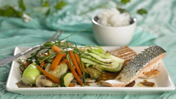 Steg laksen på grillpande 5 min. på skindsiden og 2 min. på kødsiden. Rør ingredienser til sovsen sammen. Den bruges, som den er. Grønsagerne skæres i mundrette bidder, hvidløg og ingefær finthakkes. Alt lynsteges i lidt olie i en wok. Sovsen hældes over både grønt og fisk. Serveres med kogte ris og drysses med forårsløg og koriander.
