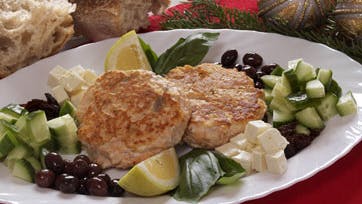 Kør laksen sej med salt på foodprocessor. Rør med løg, yoghurt, salt og peber. Steg som fire bøffer på pande med olie i ca. 5 min. på hver side. Anret med små øer af tilbehør rundt om og giv lunt brød til.