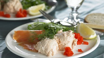 Bland lagen med laksefileten og dæk med vand i en gryde. Bring forsigtigt til kogepunktet og sluk. Lad laksen trække heri i 8 min. Tag den op af lagen og afkøl helt. Blend kogt laks med flødeost med citronsaft og skal. Lav laksen til portioner med ske og stil dem evt. på køl, mens resten gøres klar. Anrettes med salat, lakseskiver, lakseæg/kaviar og dressing samt dild og citron. Giv brød til og drik en Chablis fra Frankrig til eller en vin af samme karakter som f.eks. en Macon Blanc Village.