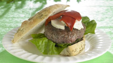 Læg peberfrugten i ovnen i 20 min. ved 170°, til du kan flå skindet af den. Skær den i kvarte og tag kernerne ud. Bland hakket kød med løg, hvidløg, salt og peber og steg som bøf på en pande i lidt olie. Steg også lige brødet eller rist det. Smør med puré og læg salatblad på. Følg efter med bøffen, så osten og til sidst peberfrugten. Kan pakkes og tages med på farten.
