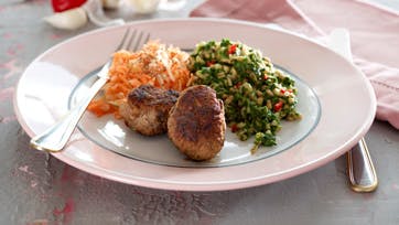 Rør lammekødet med løg, hvidløg, sambal oelek, mælk, rasp, salt og peber til en jævn fars. Kog spelten i letsaltet vand i 10 min. og hæld vandet fra. Form farsen til frikadeller og steg dem i olien ved middelhøj varme i 4 min. på hver side. Bland spinat og hvidløgsost i spelten og lad det småsimre i 2-3 min. Hak chilien fint, drys den over spinatspelten og server med en god råkost.