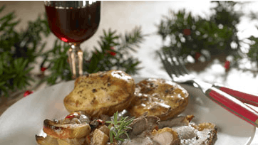 1 udbenet lammekølle4 stilke rosmarin3 tsk. groft salt2 tsk. rosenpeber4 bagekartofler2 spsk. olie2 skalotteløg2 æbler1 spsk. honning1 spsk.