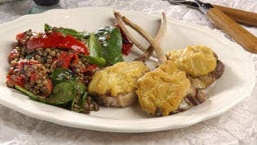Kog linserne, og mens de er lune, vendes de i dressing af olivenolie, citronsaft og sennep, salt og peber. Peberfrugter og spinat vendes i, når de er afkølede. Brun koteletterne på grillpande og drys med salt og peber. Læg dem i ovnfast fad og læg humus over hver kotelet, uden at det flyder sammen. Sæt i ovnen under grill i 4-5 min., til de er gratinerede. Server straks med groft brød og et godt glas rødvin.