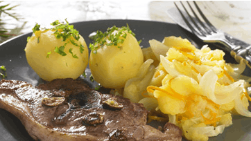 Pil løgene og skær dem og æblerne i både. Sauter æbler og løg i smørret ved middelvarme i et par min. Tilsæt honning, eddike, chili, kanel, appelsinsaft og -skal og lad det småsimre uden låg i 10 min. Krydr lammekoteletterne med salt og peber og skær hvidløget i tynde skiver. Rist hvidløgsskiverne i olien, til de begynder at tage farve, læg koteletterne på og lad dem stege i 3-4 min på hver side ved middelhøj varme. Server med persille-dryssede kartofler.