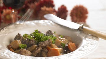 Svits løg og hvidløg i lidt olie, til de er klare. Tilsæt kødet sammen med paprikaen og brun det af. Hæld bouillon og rødvin ved kødet og lad det hele simre i 20 min. Skær kartoflerne i tern og gulerødderne i skiver. Kom kartofler og gulerødder ned til kødet og lad det simre i yderligere 20 min. Tilsæt fløde og ærter og kog retten igennem. Smag til med salt og peber og server retten drysset med persille.