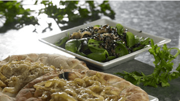 Begynd med at koge linserne i saltet vand i 15 min. Steg så løgene i olien, til de er glasklare. Tilsæt karry og hvidløg. Læg brødene på bageplader og drys med ost og ¾ af løgblandingen. Sæt dem i ovnen ved 180° i 5 min., til osten er smeltet. Bland resten af løgblandingen med de kogte linser og vend det med skyllede spinatblade. Server med brødene til.