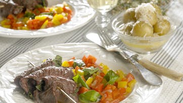 Rør citronsaft med salt og friskkværnet peber og smør det på ene side af hvert kødstykke. Læg en stilk basilikum og en stilk mynte i hvert stykke, rul sammen og sæt 2 ruller på hvert spid, så der er 8 spid ialt. Steg over grillen eller i ovnen i ca. 12-15 min., til det er lige akkurat gennemstegt. Kog kartoflerne i 20 min. og pil dem. Vend i lidt smeltet smør og drys med revet parmesan. Skær imens peberfrugterne i tern, hak løg og hvidløg og steg det hele i lidt olivenolie i 8 min. Drys med salt og peber og pynt med basilikum.
