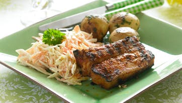 Grill spareribsene ved jævn varme i 15 min. på hver side og servér med persilleristede kartofler.