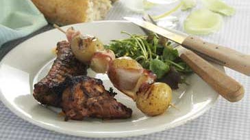Bland soja, tomatpure, olie, paprika, hvidløg, salt og peber til en ensartet marinade. Hæld marinaden over kødet og lad det marinere på køl i mindst et par timer. Kog kartofler og hvidløgsfed i letsaltet vand i 15 min. Sæt kartofler, hvidløg og baconskiver på spiddene. Grill spareribs ved middelvarme i ca. 12 min. på hver side og kartoffelspid ca. 6 min på hver side. Server med grøn salat og brød.