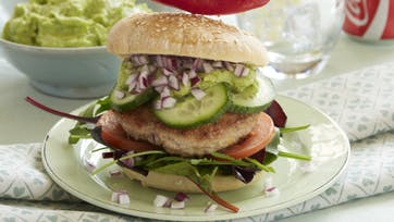 Flæk de lune burgerboller og læg dem sammen med ketchup, salat, bøffer, tomat, agurk, rødløg og gaucamole og servér.