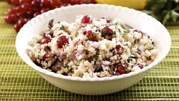 Kom smør og couscous i en skål, hæld kogende vand over, lad det trække i 4 min. og løsn det med en gaffel. Skær imens kødet i strimler og bland kød, persille, mynte, bær, løg, citron og olie op i couscous'en. Kan medbringes i boks til frokost eller spises en travl aften.