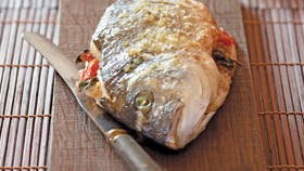 Udben fiskene. Sautér hakket løg og hakket hvidløg i olien. Kom hakkede tomater i og steg til en grød. Tilsæt revet ingefær og hakket, grøn chili. Kom fyldet i fiskene sammen med basilikum og mynte. Giv skindet små snit. Sæt i ovnen ved 250° og dryp med olie. Steg i ca. 15 min., til skindet er sprødt, og fyldet kogt igennem.