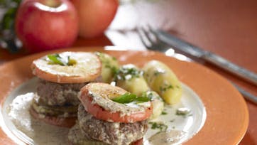 Skær kernehuset ud af æblerne og skær dem i 2 cm tykke skiver. Pil løgene og skær dem i ½ cm tykke skiver. Bland kødet med salt og peber. Form farsen til 8 små bøffer. Varm smørret på en stegepande, steg først æbler og løg 2 min. på hver side og tag dem af panden. Steg bøfferne 2-3 min. på hver side. Bland fløde og sennep og hæld det ved. Simrer 5 min. og smages til. Server bøfferne i saucen med æbler, løg og små kartofler.