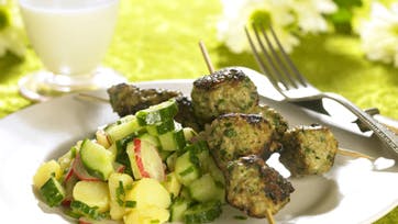 Rør kødet med æg, mælk og rasp. Hak spinaten fint, riv løg og hvidløg og bland det i farsen sammen med salt og peber. Form små frikadeller af farsen og steg dem gyldne i olien ved jævn varme i 3-4 min. på hver side. Halver agurken, fjern kernerne og skær den og kartoflerne i tern. Skær radiserne i tynde skiver og bland dem med agurk og kartofler. Rør limesaft, olie, salt og peber sammen, hæld det over og server.