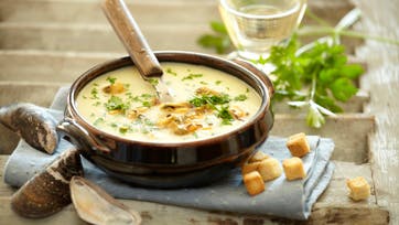 Skræl kartofler og selleri og skær dem i mindre stykker. Pil løgene og skær dem i mindre stykker. Svits grønsager og kartofler i en gryde i smørret. Kom timianen i gryden og hæld bouillon ved. Lad det mørne under låg på 25-30 min. Fjern timianen. Purér suppen, hæld den tilbage i gryden og tilsæt mælk. Varm suppen op og smag til med salt og peber. Hæld væden fra muslingerne og kom dem i suppe. Drys persille over og servér croutoner til.