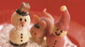 På billedet har vi brugt ren rå marcipan, lidt rød frugtfarve, kokosmel, blød nougat, overtræk og en god portion fantasi.