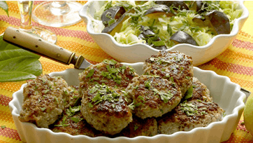 Mos kartoflerne med en gaffel. Hak nødderne fint. Bland kødet med kartofler, nødder og citronskal og salt. Rør mælk og æg i til en ret fast fars. Form den til frikadeller med en spiseske og steg dem på panden ved mellemvarme 4-5 min. på hver side.