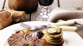 Skræl kartoflen og skær i 3 mm tynde skiver. Skær courgette i samme tynde skiver. Læg dem som stabel skiftevis med salt og peber og lidt olie mellem hvert lag. Bag dem i ovnen ved 180° i 30 min. Læg pillede, hele skalotteløg i ovnen sammen med kartoflerne og dryp med olivenolie. Kom hakket skalotteløg i en lille gryde og sauter i lidt smør eller olie. Tilsæt morkler og efter 2 min. kalvefond. Kog ind i 10 min. og rund af med cognac, salt og peber. Steg bøfferne drysset med salt og peber ca. 2-3 min. på hver side ved høj varme og server straks med kartoffeltårn og morkelsauce.