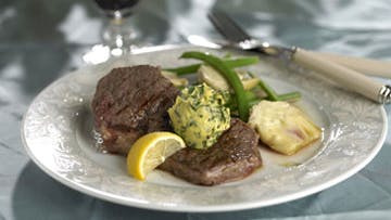 Rør alle ingredienser til kryddersmørret. Nip bønner og kog i saltet vand i 8 min. Bland de varme bønner med lidt af kryddersmørret. Læg artiskokkerne i et ovnfast fad, hæld vin og olie over og stil i ovnen i 8 min. Ved 225°. Steg bøfferne ved høj varme på grillpande i ca. 4 min. på hver side og server med bønner og artiskokker, lidt citron og en klat kryddersmør.