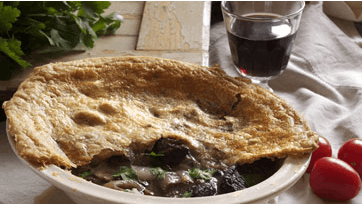 Gør løg og svampe i stand. Varm olien op og brun bacon og kød af et par omgange i en stor gryde. Tag kødet op og tilsæt så skalotter og svampe og svits, før du tilsætter kød og bacon igen. Drys med mel, salt og peber og hæld vinen ved, til det jævner let. Lad det småsimre i 1 time og smag til. Tænd for ovnen på 220°. Hæld gryderetten i et ovnfast fad og læg låg af butterdej på. Det pensles med æg både for at blive brunt og for at sidde fast på kanten. Giv den 25 min. midt i ovnen. Server med salat og drys med persille.