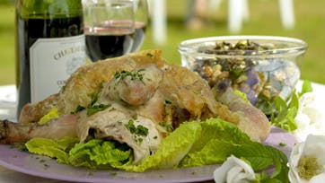Gnid kyllingen med olivenolie, hvidløg og salt og læg den i en lille bradepande. Sæt den i ovnen på midterrillen ved 200° ca. 11/4 time, til den er mør. Stik i overlåret, kødsaften skal være klar.