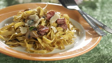 Sæt vand tilsat salt over til pastaen. Rens champignonerne, skær dem i skiver og hak hvidløgsfeddene fint. Varm en stagepande godt op, tilsæt olien og lad den blive varm. Kom svampe og hvidløg på panden, rist i et par min. og krydr med salt og peber. Skær skinken i mundrette stykker og lad dem stege med på panden. Kog pastaen i 2-3 min. og lad den dryppe godt af. Vend pasta og hakkede basilikumblade i svampeblandingen og server med friskrevet parmesan og brød.