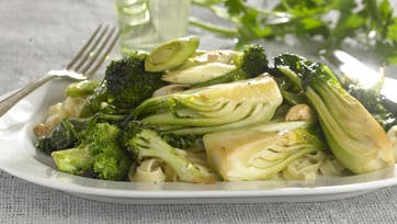 Steg nødder i olie i en wok. Tag op og gem. Steg så løg og broccoli i 2 min. tilsæt ærter og kinesisk bok choi, og steg videre i 1 min. Kog pastaen efter anvisning på pakken. Dræn og vend i grønsager med hoisinsovs og nødder. Server straks.